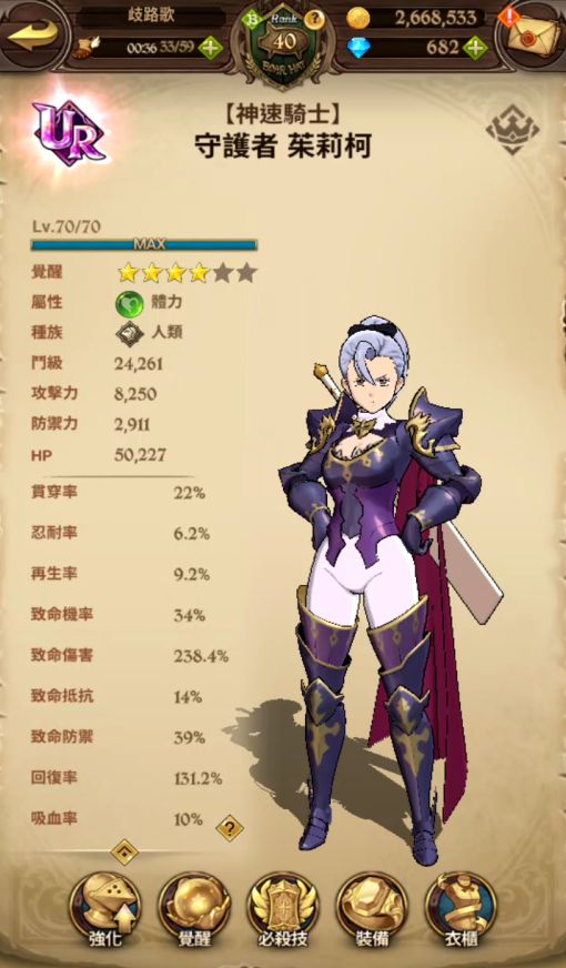这是我小号现在的属性,0氪,主力队伍左R右C基本全升到5星,神速两件SSR输出装5星