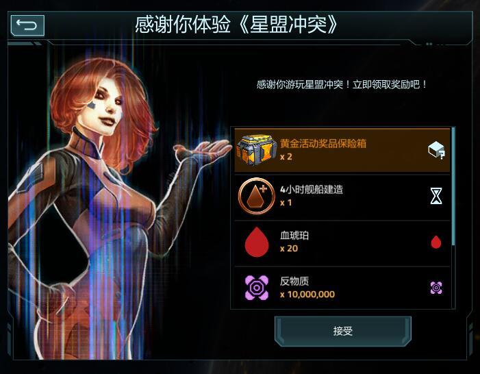 2月15日-2月21日每日登录可领取,包含黄金活动奖品保险箱X2、4小时舰船建造时间代币(通用)X1、血琥珀X20、反物质X1000W、氦-3X1000W、矿石1000W。
