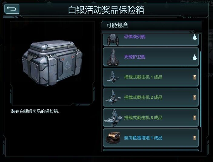 白银活动宝箱能开出:长吻鳄巡逻艇(3.333%)、秃鹫护卫舰(3.333%)、恐惧战列舰(3.334%)、成品搭载式截击机1/2/3成品(基地用)(20%、15%、10%)、航向鱼雷炮塔1/2/3成品(基地用)(20%、15%、10%)。