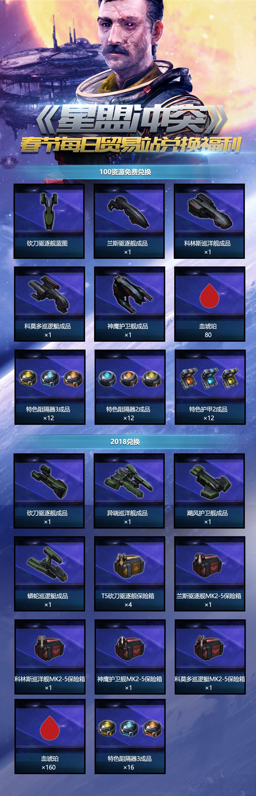 除此之外,为了更好的照顾玩家们的发展,2月13日-2月20日期间,拉若斯的贸易站也会开启春节每日兑换福利!其中,礼包分为100资源兑换宝箱与2018金币宝箱, 各位指挥官使用每日兑换对应宝箱可获得下列部分内容!