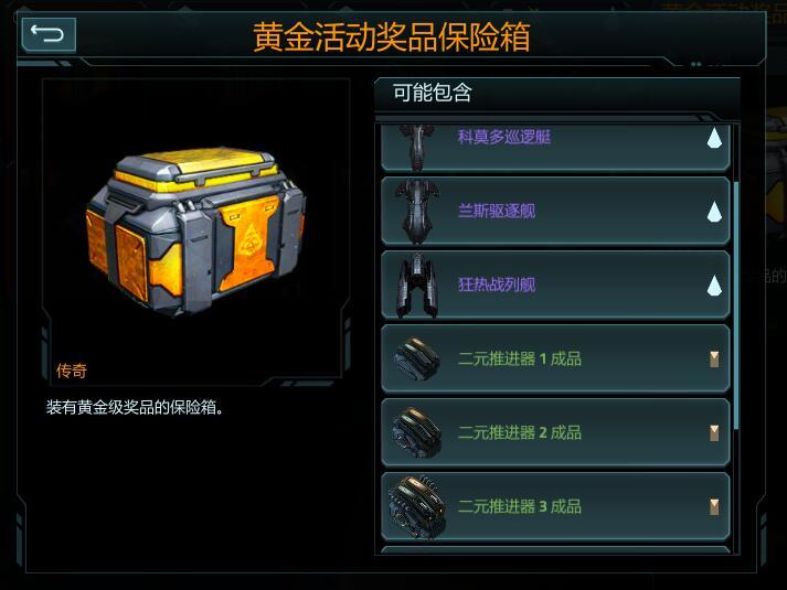 黄金活动宝箱能开出:瓦尔哈拉航空母舰(5%)、科莫多巡逻艇(5%)、兰斯驱逐舰(5%)、狂热战列舰(5%)、二元推进器1/2/3成品(20%、12%、8%)、加特林射线1/2/3成品(20%、12%、8%)。