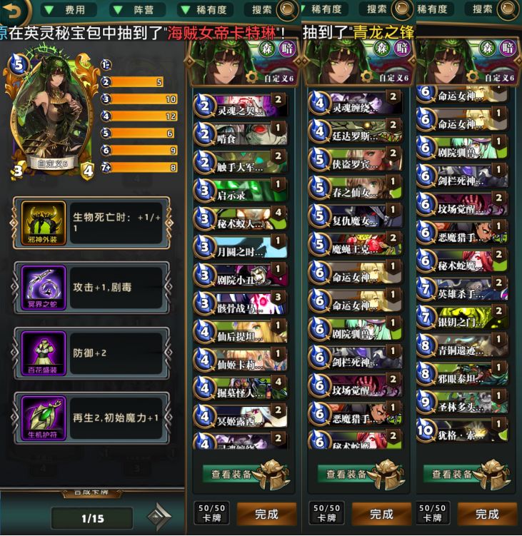 6费期:命运女神过牌抗伤害,驯兽师给蚂蚁上毒召唤大老虎或者小猫咪,坟场觉醒复活大哥,剑兰死神强无敌拉满,恶魔猎手卡魔法,蛇姬喷毒拉满。