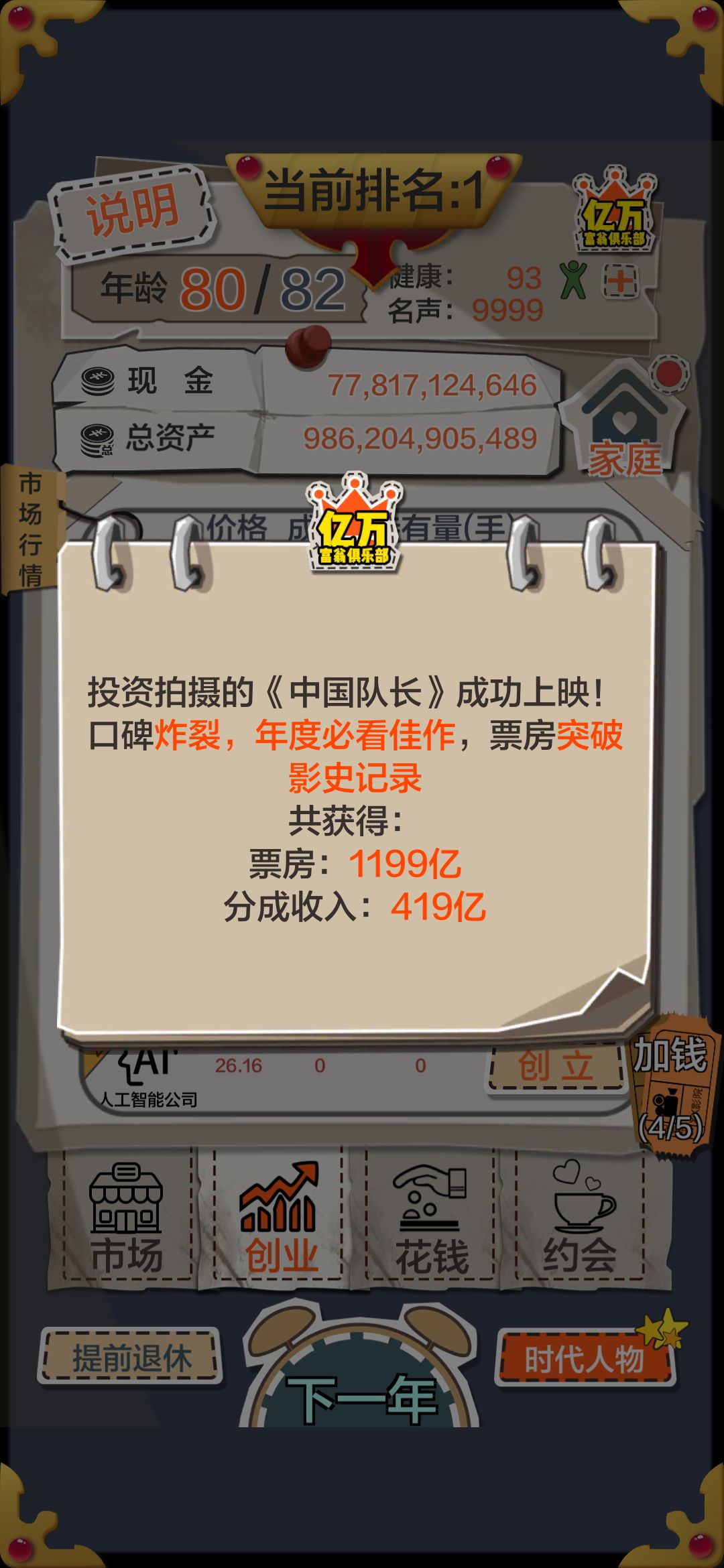 不推荐靠拍电影赚钱,双球队加制药厂妥妥速赚,等资金有个五百亿左右,可以耍电影了,王首富的标准最低550亿,最高750亿左右,有可能会到780亿,所以为了确保挑战成功,起码票房要达到790亿。下面先上图再接着谈。