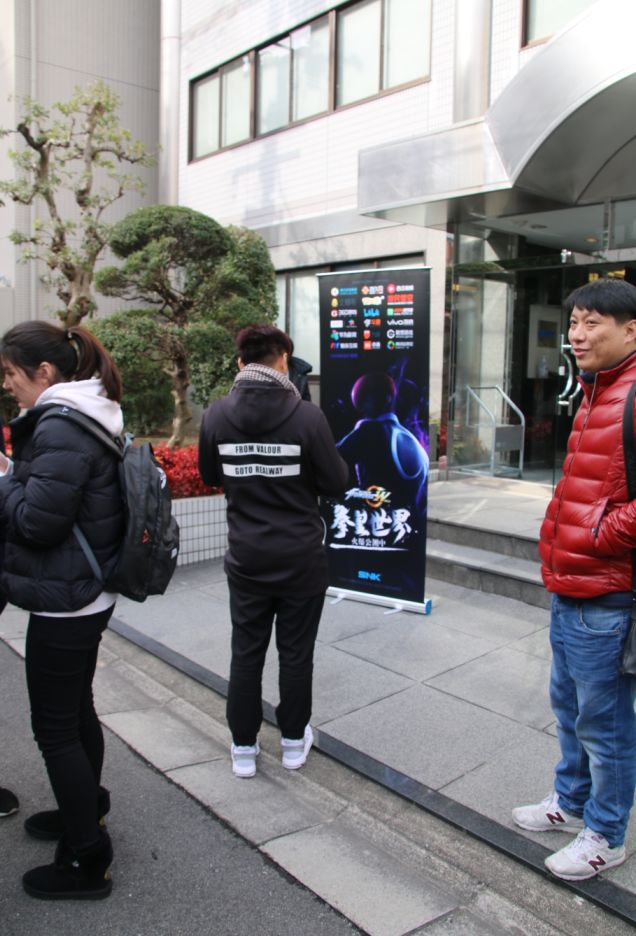 随后我们前往SNK正门,等待入场,下图为在入场之前,世界冠军小孩伫立在《拳皇世界》的易拉宝面前。