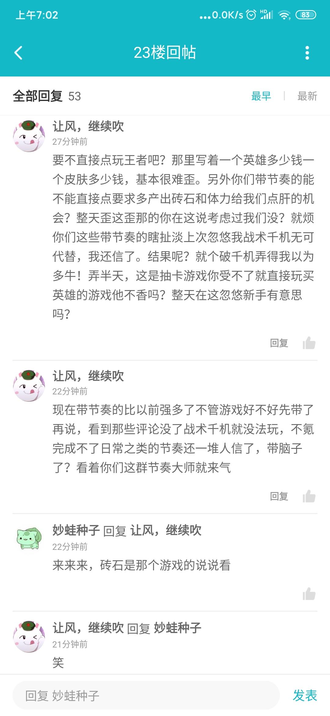 过来先给我带了个节奏大师的帽子,由于我最近沉船,比较暴躁,我就跟这人扯起来了,他说战术千姬不强,我想人家节奏榜挺高我自己用着也挺好用,我就说了我自己的理解,我说战术千姬是顶尖的破盾手,(可能有那么一点点夸张,但个人观点嘛,我就是喜欢(´-ω-`)),然后呢,这人说我说战术千姬是顶尖破盾手就是带节奏,因为战术千姬不强,一开始我就跟他争上了,因为沉船buff所以多有口吐芬芳,冷静下来后我还发了个道歉的,然后我又觉得这人上来就给我戴帽子说我带节奏,我不服就又跟这人扯起来了,然后这人说是不是他证明千姬不强就证明我是带节奏,说到这我突然感觉不对了,然后这人让我说我魔神兵的战力,我就老实的说了我一队生物1.6万,第二个难度遇到了那个地图错误的bug就没再打了(氪金只抽卡不肝体力的就是这么inba,就是吃30%保底就成)然后截止到我编辑这个帖子之前他还没回我,但我反应过来了啊,在这之前我从来没有说过战术千姬强无敌啊,我也没有发过类似的帖子或者回复说我推荐新手抽这个,这个老强了。是这个人跑过来跟我扯战术千姬强不强的啊,我说出自己认为战术千姬强咋就变成带节奏的啦?我从来没有主动提过这个,只是自己认为她强,除了这个人跑过来跟我扯这个的以外,我从来没跟其他人说过战术千姬强这一观点啊?我咋突然变成带节奏的节奏大师了?请各位大佬帮我梳理一下,我现在只有一种说不出的,类似吃到苍蝇的恶心感。ps我和他的争论完整版在隔壁大佬那个期望的帖子里,有点暴躁,有点口吐芬芳让大家见笑了见笑了。![[嗒啦啦2_乖巧]](https://img.tapimg.com/market/images/e1c24f8566fda8255009cae7e503676c.gif)