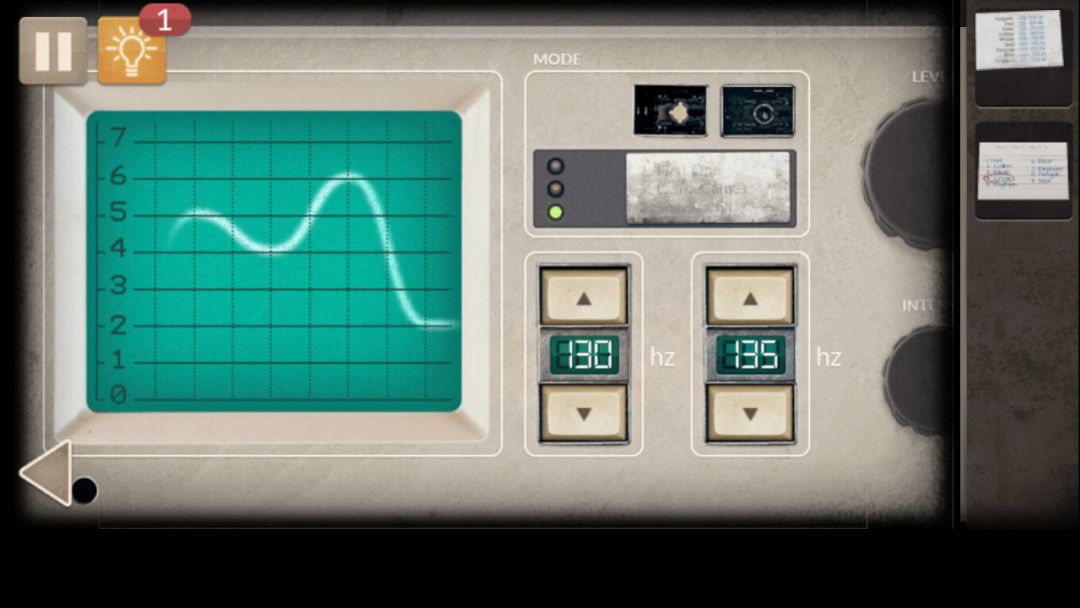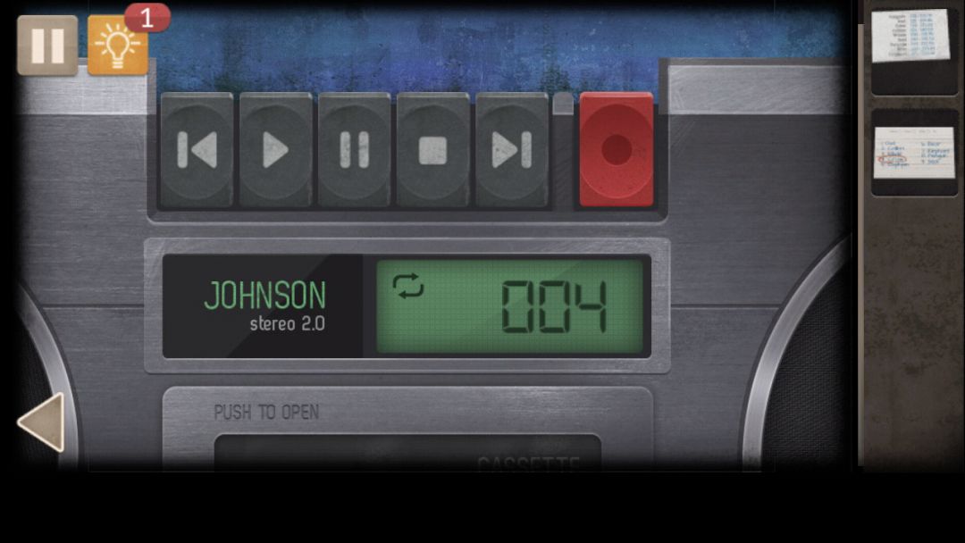 得到钥匙和磁带.来到一开始的房间,用钥匙和密码8153打开墙壁上第一个密码柜,拿到曲目列表,将之前拿到的线连接收音机,放入磁带,调整收音机