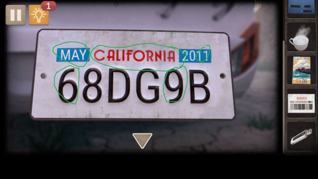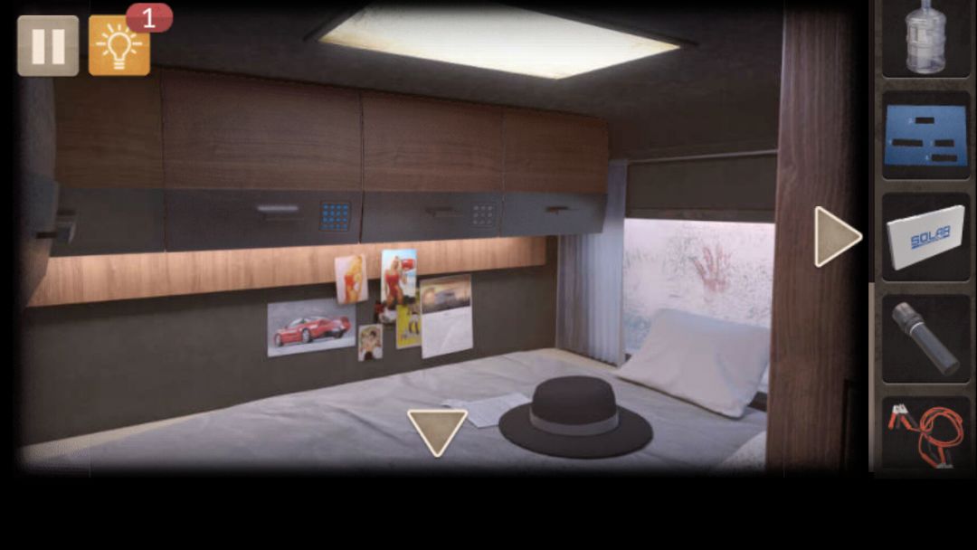 4. 使用螺丝刀卸下车牌,(注意车牌,后面用到)使用手电筒,获得卡片和图纸,车顶安装灯泡,放好太阳能电池板,观察灯泡,结合图纸,回到车内,解开床上墙壁柜子密码(重合的部分)