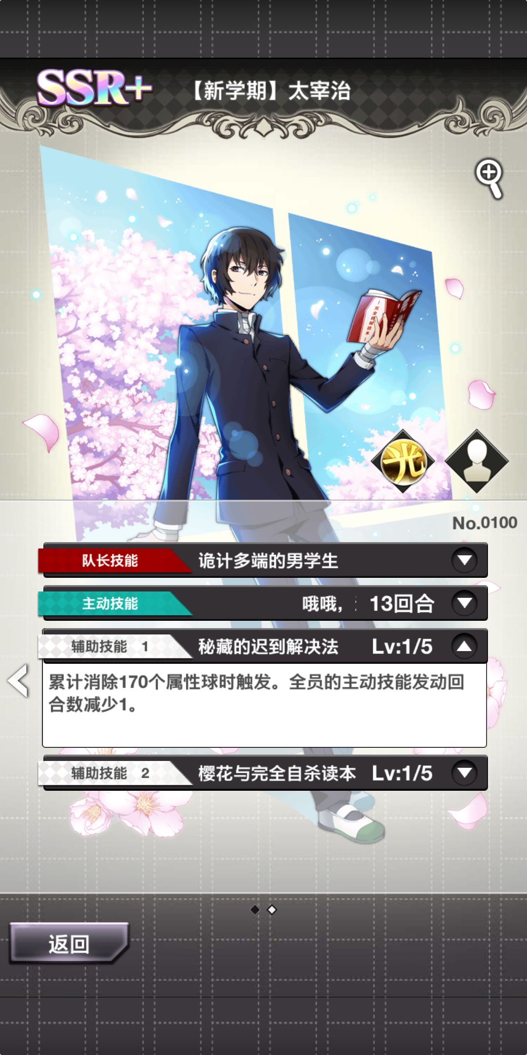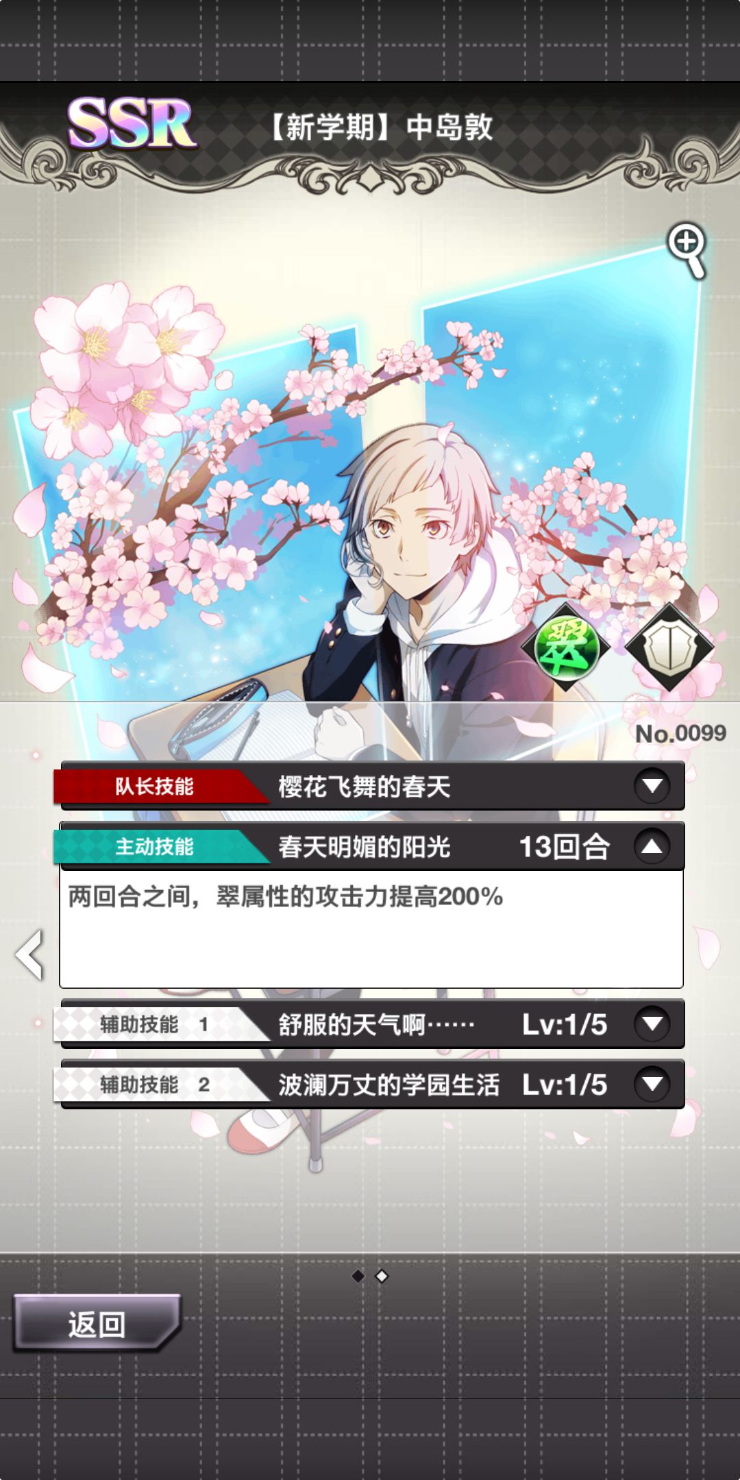 先写结论,没有翠队的以及不打算组翠队的,可以不用抽这次的池子(粉丝除外)这次池子里的两张限定卡一张翠属性「新学期」中岛敦和一张光属性「新学期」太宰治,太宰强度不高,定位观赏,中岛主动技能在拐里算第一梯队,可以做队员,没有翠队阵容,也不建议抽。