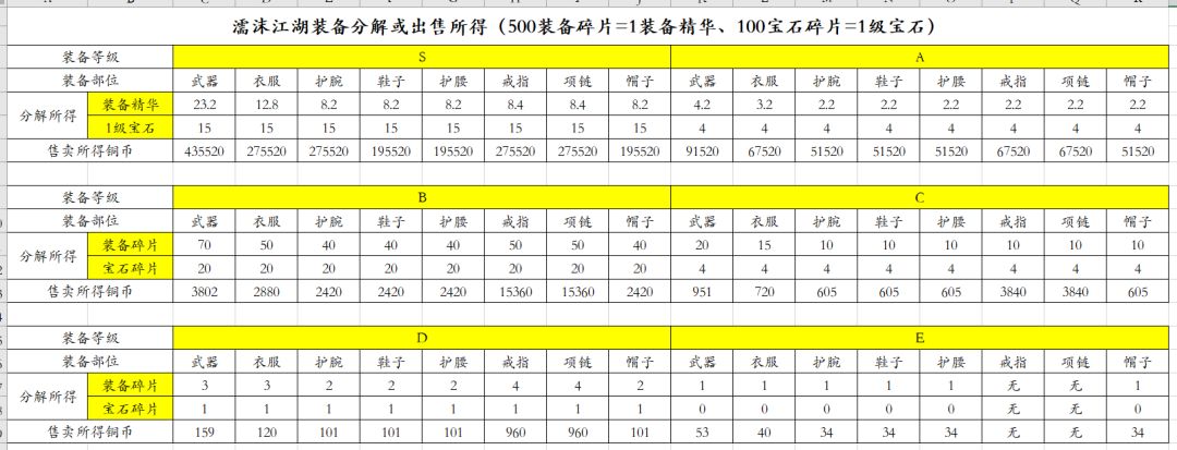 整理了一下游戏内所有类型装备分解或出售所得,根据500装备碎片=1装备精华,100宝石碎片=1级宝石,进行了相应换算。