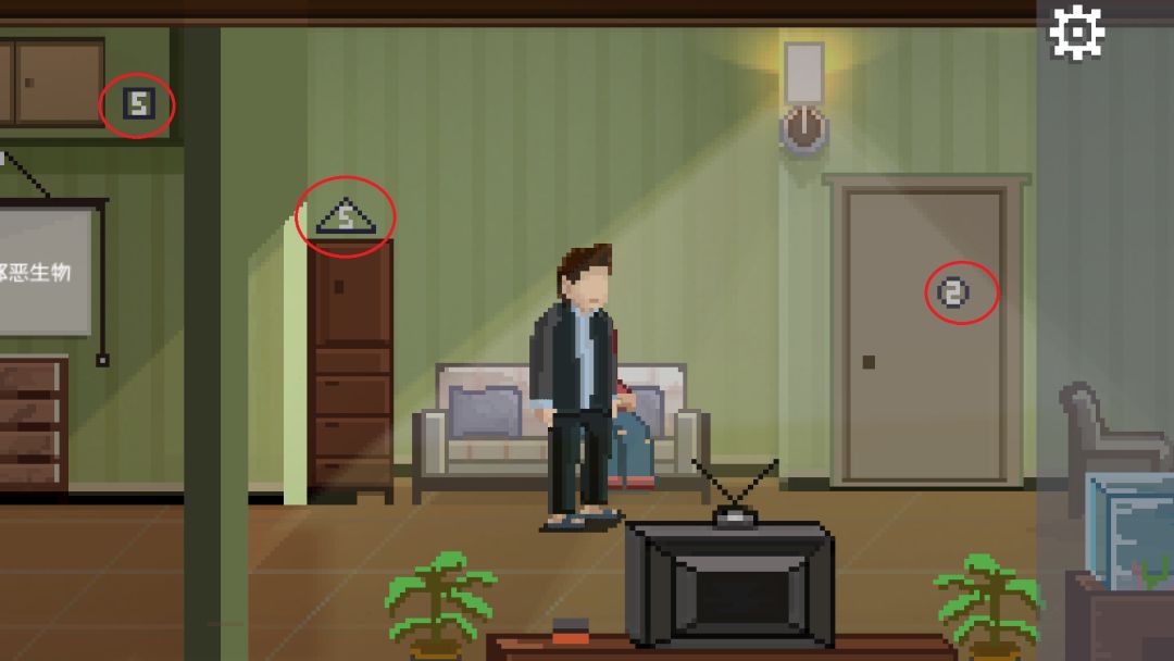 回到门口点墙壁上的白色不明物,上排黄圈按钮可以转动橱柜方向,将全部四个橱柜(黄色)转成和红圈一样的方向即可(获得钥匙)。将钥匙插入宝箱后获得密码箱,密码对应的图形是△、○、□,即墙上的提示“525”。