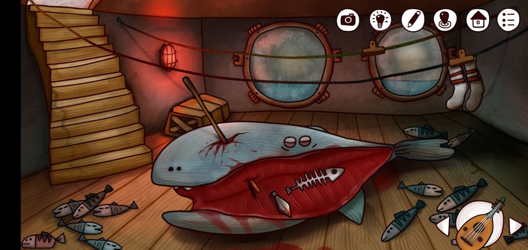 9.接下来,就把得到的道具刷完吧,首先去船上抓鱼给研究员(喇叭的按位顺序也是随机的自己慢慢试);然后去船内,可以通过刷新的方式解锁两个神秘成就(觉得刷新不出来,你可以点点人退出去再来大概要刷十几次两个就出来全了)别忘了拿胶带;接着去楼上给鱼喂鱼饵可以得到船底的通行密码:63942,开门后不急去拿飞鱼找疯了的研究员换刀,等会来了解它
