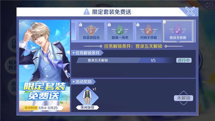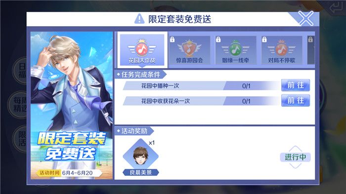 在“限定套装免费送”的活动中,连续登陆5天就可以依次解锁活动任务,其中包括“花园大作战”、“惊喜游园会”、“姻缘一线牵”、“对局不停歇”和“挑战无极限”五个任务,每天解锁的任务中又会包含两个小任务,完成了条件就可以获得相应的奖励!