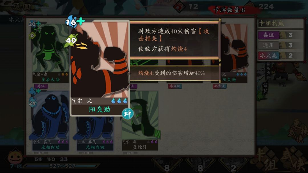 阳炎劲:在冰火岛因为有冰火莲所以两张就可以100%伤害,其他地图阳炎劲要三张升级