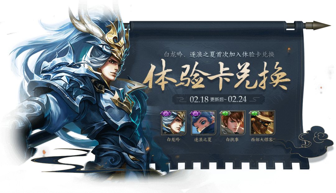 1.【体验卡兑换】韩信-白龙吟,李元芳-逐浪之夏首次加入兑换