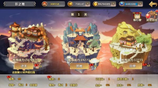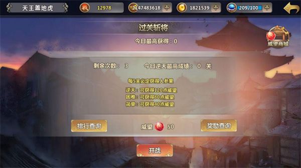 玩家每天有3次挑战机会,有简单、困难、逆天三个难度等级,挑战分别可以获得40/80/120点威望。