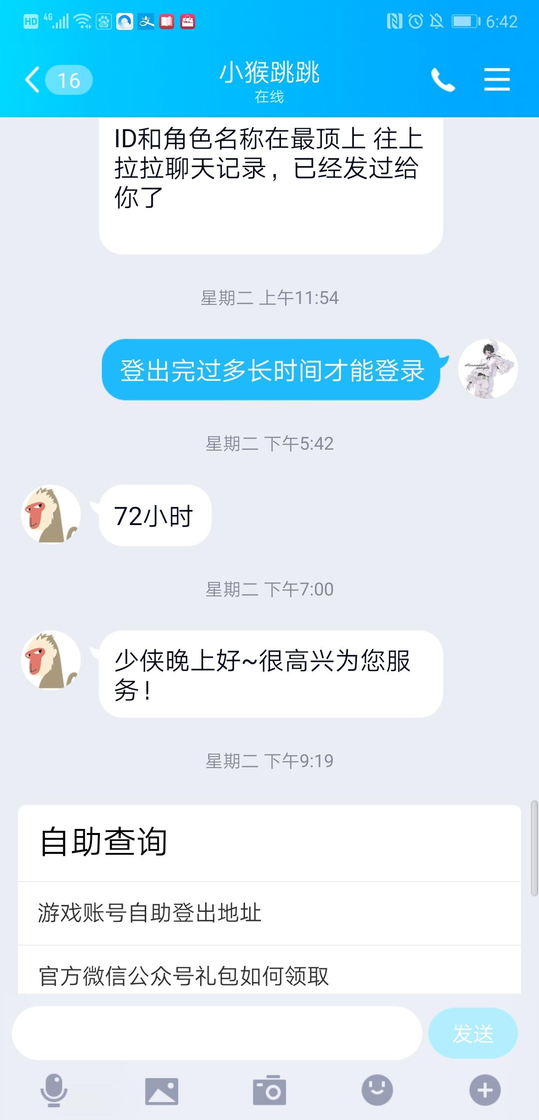 3月5日,我加上客服QQ,每天雷打不动的跟客服要ID,每天都是排队。3月10日,客服终于回消息,给了我ID,然后我去登出。按流程登出后,显示已经登出成功,但游戏没办法上号,问客服,客服告诉我要等72小时登录游戏。今天是3月15号,依旧登录不了游戏,我呵呵了。登录流程没问题,页面确实显示的是登出成功,但就是登录不上游戏。我真没想到,一个游戏我只是登录就能用10天时间,不愧是佛系游戏,我真没那个耐心了。玩了好久的账号,两个号都是二三转了,本人颜控,当初为了刷容貌充了不少钱,这次号没了心态爆炸,也不想重玩了,拜拜吧。