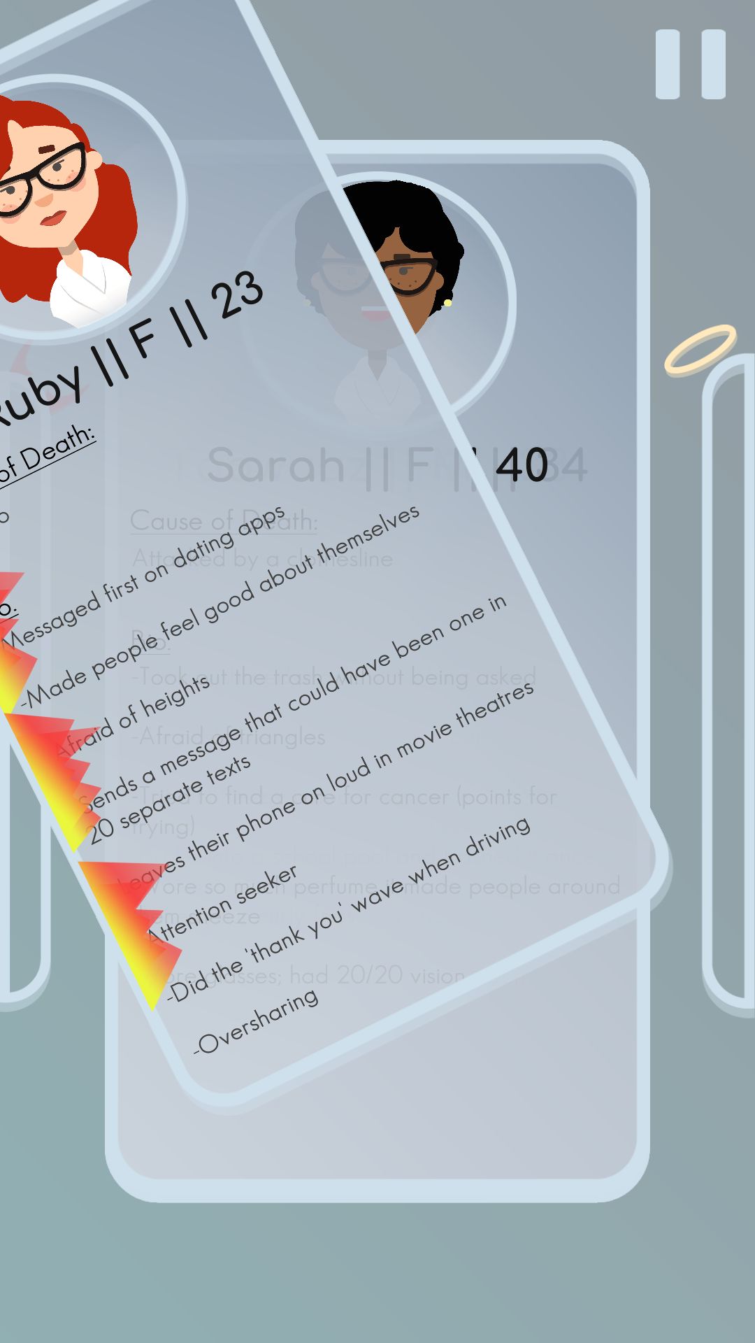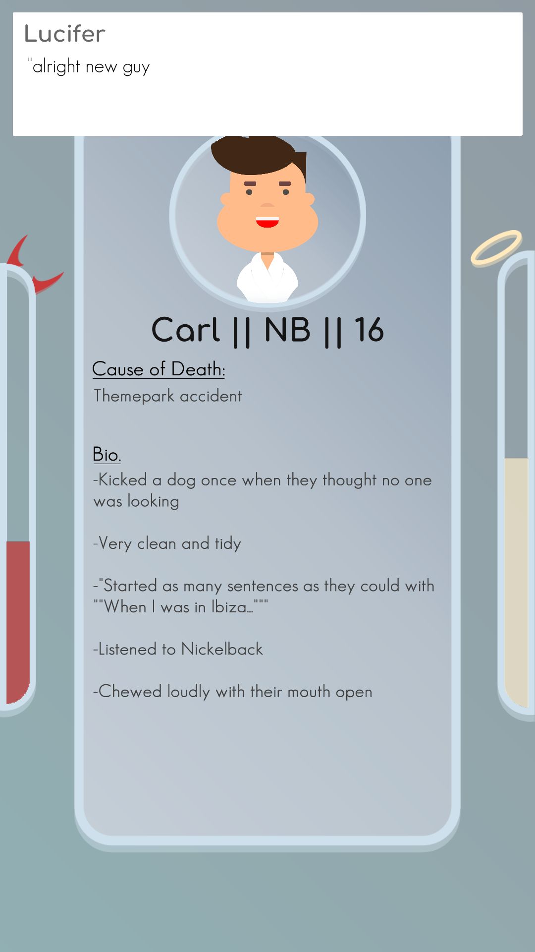 吃饭吧唧嘴会被送进地狱吗?在《Grimder》这款游戏中,你扮演的死神需要操作一款类似约会应用的软件,通过左右滑动的方式来将一个个灵魂送进天堂或者地狱。而提供给你作为判断依据的是有关这个灵魂生前行为习惯的描述。判断错误的代价则是天堂或地狱的空间会被迅速填满(契合了本次Ludum Dare 42 “Running out of space”的主题),同时你也会收到两边看守粗鲁的抱怨。此外,开发团队也在介绍中提到,这款游戏的制作带有一定的宣泄性质,很多会把一个人送进地狱的标准只是他们自己无法忍受的事情,大家也不必过于较真(游戏下载戳这里)