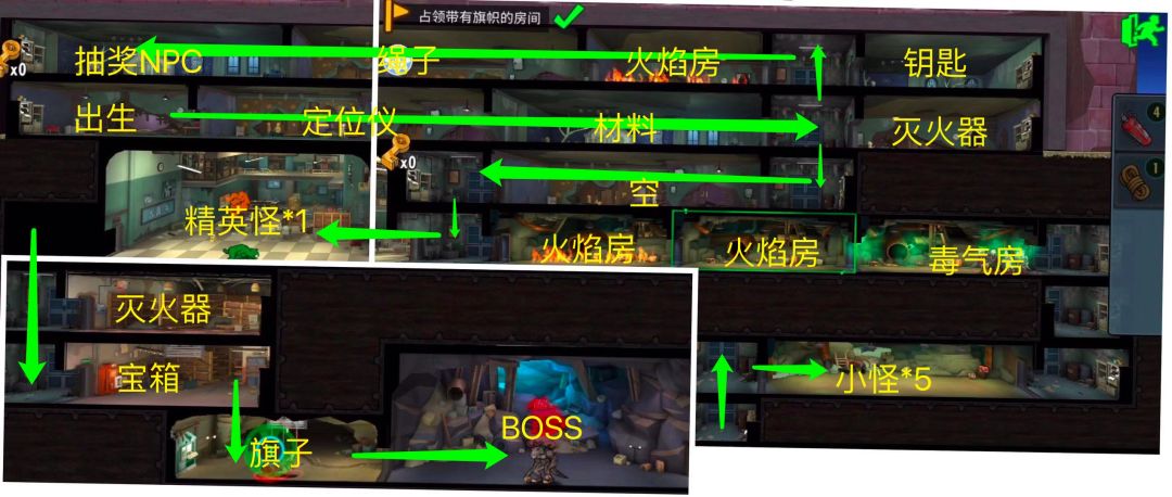 此图有一处固定抽奖NPC,路线可以按照我的绿色箭头走,宝箱那里用一根绳子直接拿旗子