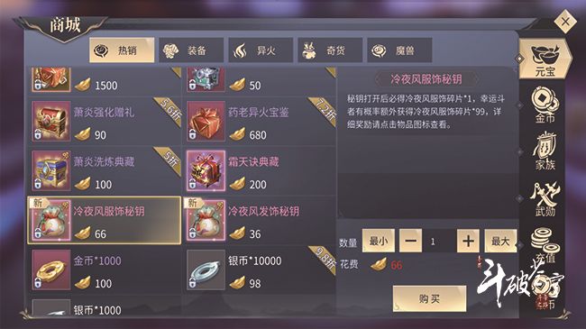 新时装在版本更新后,可以通过元宝商城购买。夜冷风服饰秘匙66元宝,夜冷风发饰秘匙36元宝,每次必得一个夜冷风服饰碎片或发饰碎片并随机额外获得其他奖励,有概率获得99个服饰碎片哦。一发入魂,随后在合成界面合成就可以得到我们炫酷的新时装啦。根据非欧皇和非酋的运气来预算,5000左右的元宝就可以获得苍月冷夜风了哦。