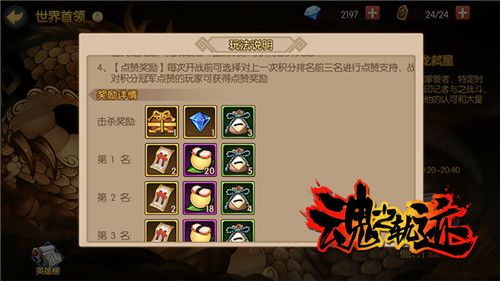 世界BOSS不好战胜,但一旦成功奖励也是十分丰厚的。根据伤害排名,玩家们能获得保底符、灵石袋、宠物丸子等各类奖励,而且只要参与活动就有灵石袋和宠物丸子送上,人人有份永不落空!对BOSS打出最后一击的幸运玩家,还将额外获得钻石、钱箱等奖励!