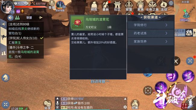 还有一点小提示:完成番外任务所需要的部分道具需要通过日常积累获得,例如“乌坦城的凌霄花”,只可以通过学院修行、药老试炼、家族饲养等方式获得,因为是增加万丈红尘好感度的道具,大部分人都会选择直接用掉,结果就是任务进行不下去了。所以建议大家将这种特殊道具保留一下,以尽快完成番外任务,获取丹方。