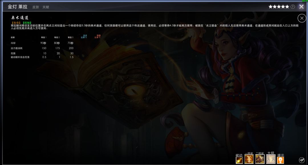 莱拉大招非常的特殊,是虚荣里唯一一个敌我双方都可以互动的技能,技能描述已经很详细了,释放需谨慎。有时候一波团战成也大招,败也大招。注意千万不要试着用一级大招去穿某些感觉可以穿过墙体……(经常卡墙),要学会在团战追击逃跑时决定23技能连招还是32技能连招,23在逃跑中可以快速脱离战场并且敌方不可使用传送门,32连招可以出其不意切入敌方后排。