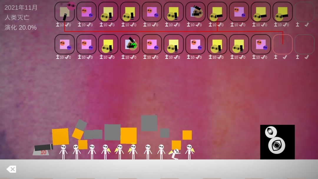 如题,在一开始死了几次之后,闲的没事试试自己用箱子把所有人都压死会怎么样,结果人类灭亡之后还可以玩,演化也在加