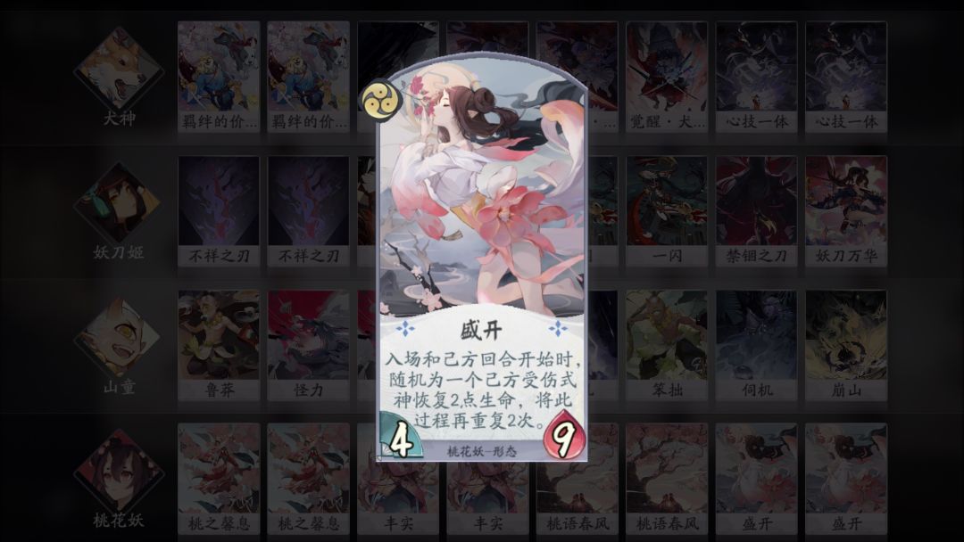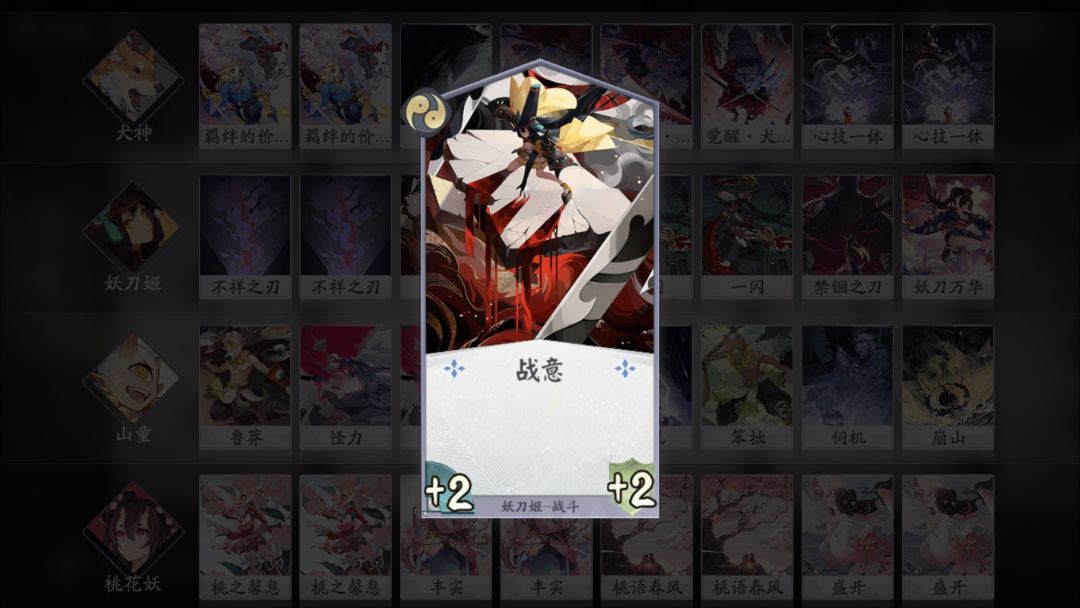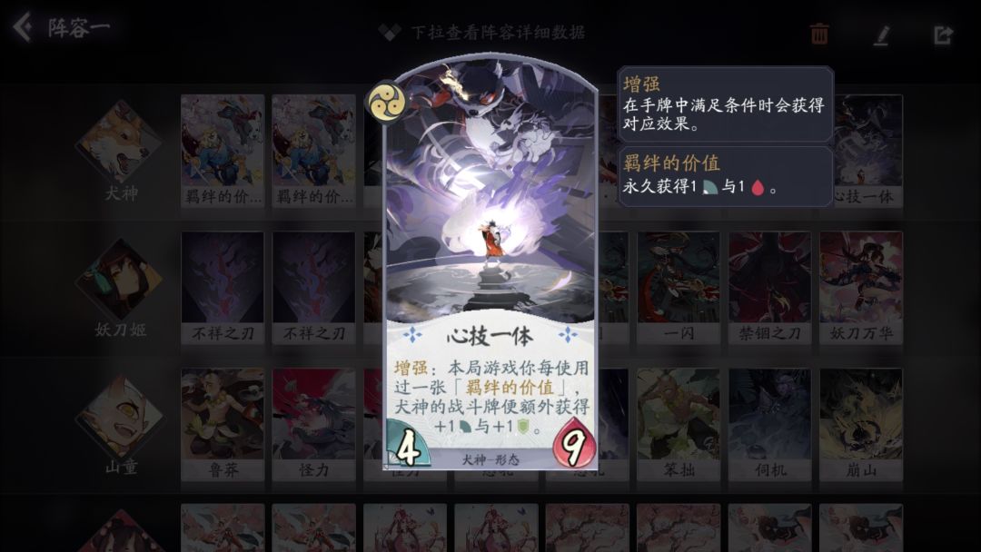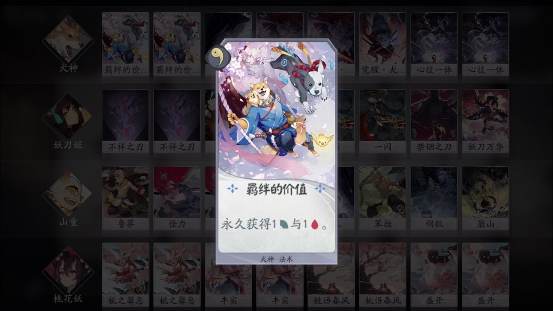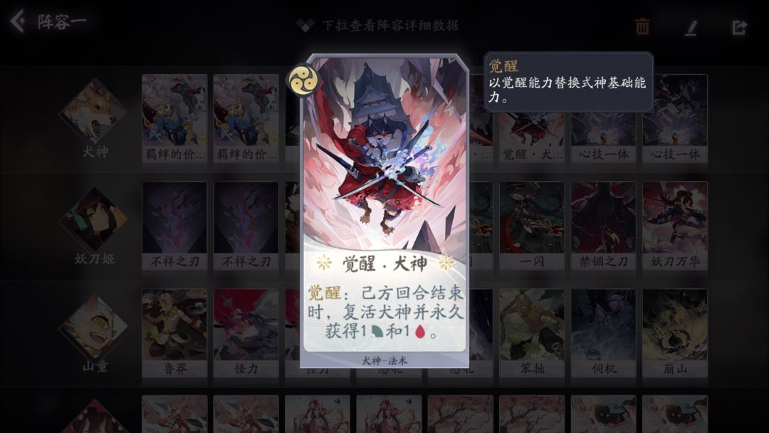 犬神后期3级时,吃了五张羁绊配上形态以及觉醒(没有觉醒的可以暂用其他牌代替),犬神基础属性(不加桃花的加成)都可以达到可怕的10+/10+!