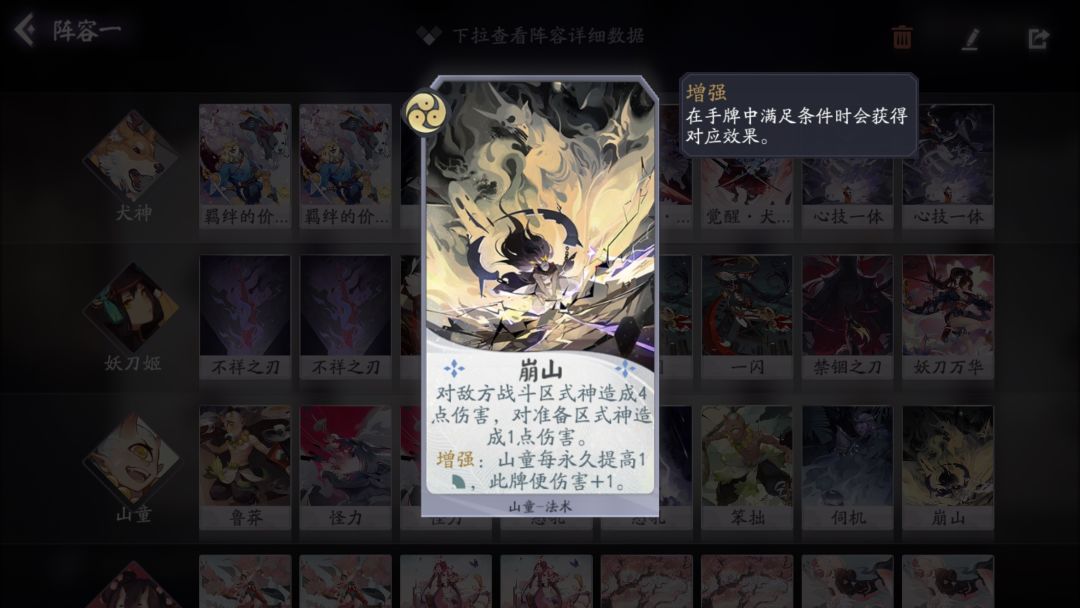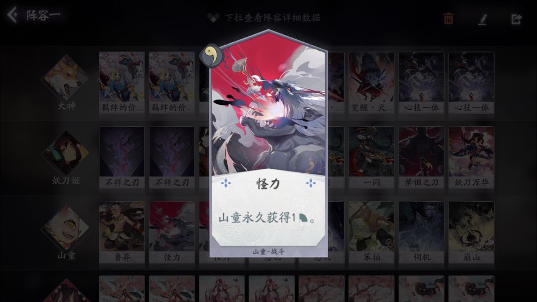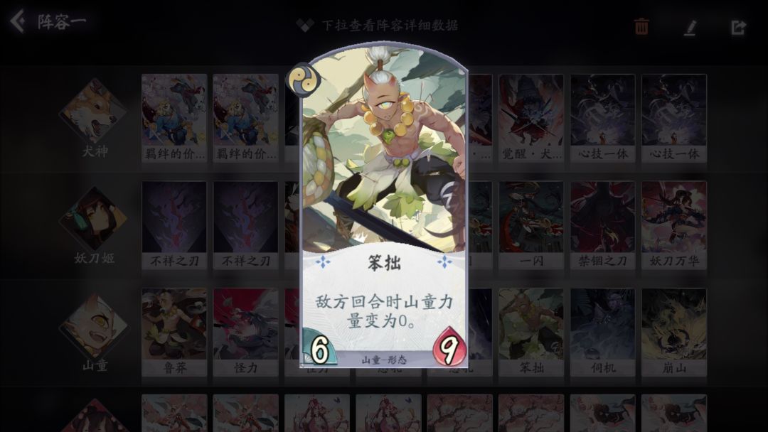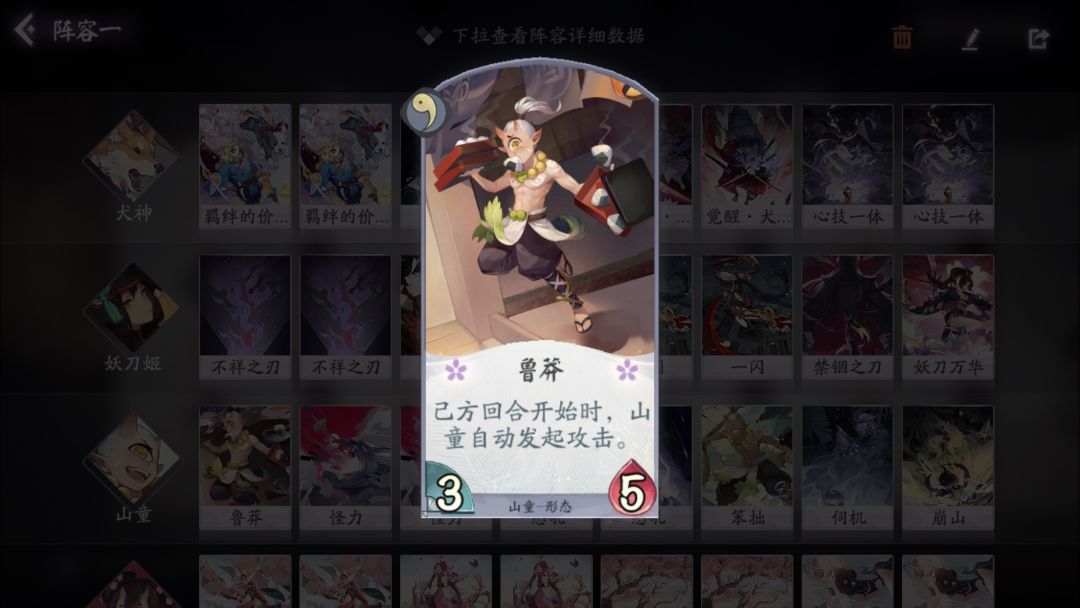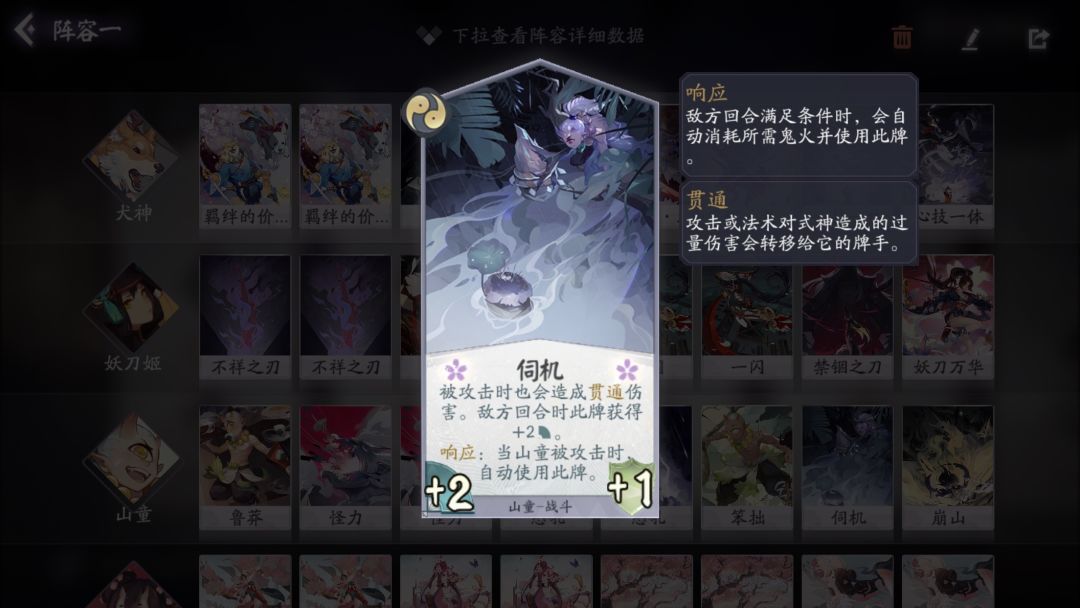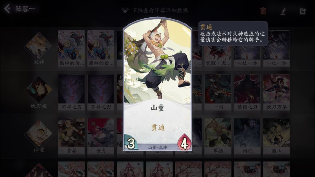 贯通:如果你打败式神所溢出的伤害会打到牌手身上。补刀岂不是再合适不过了?就算因此而死也是很合适的:与对面式神同归于尽,还能对对面牌手造成伤害:10/2的酒吞怕不怕?犬神妖刀上去就是死太不合适,这时候我们的山童同学打你一锤同归于尽,还能给你牌手一点伤害,三个回合后山童又是一条好汉!