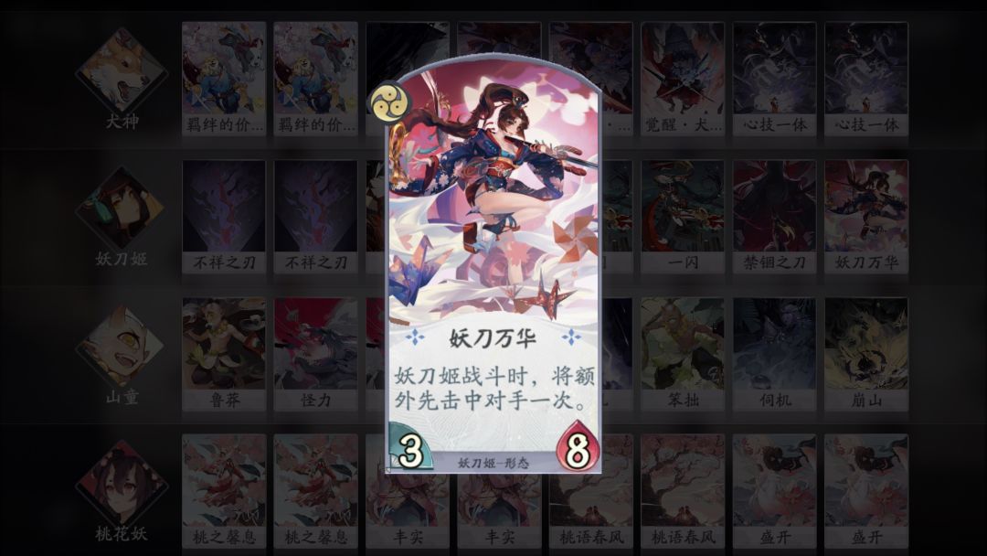 当然妖刀还可以补刀,如果犬神把对面式神打气绝,你就可以用妖刀的战斗卡对牌手强力输出,因为两张一闪可以不耗火使用,配合妖刀能力还能多扔一张战斗卡,可以打出小爆发。真正的爆发是,后期妖刀的形态——妖刀万华。