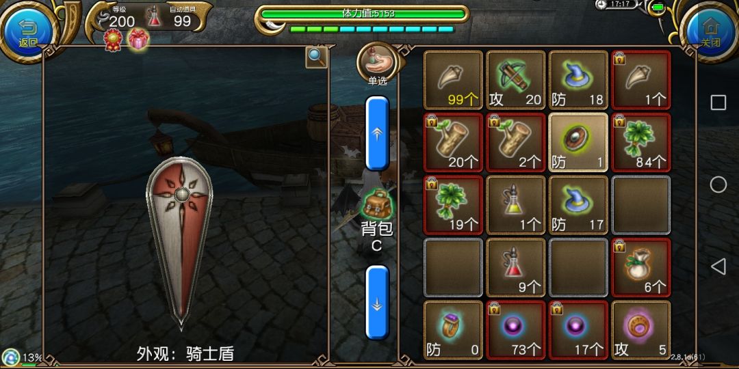 装备:骑士盾(盾牌,防御力1点,附加属性:格挡率10%,格挡力22%,体力上限增加90点)