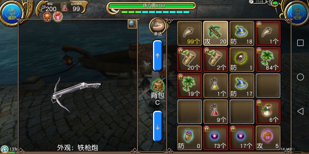 装备:铁枪炮(弩,攻击力20,附加属性:魔法值上限增加100点)
