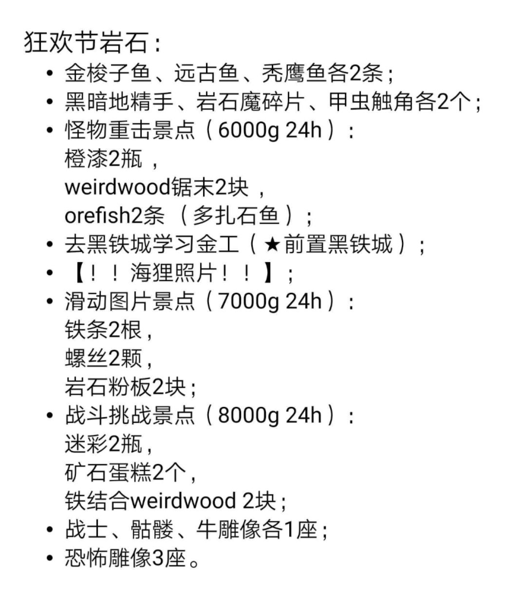 为了方便大家规划仓库的物资管理,免得步我后尘,故做此攻略。像把多扎石鱼卖掉这种傻事还是别做的好,还有放着两天南瓜不采(仓库满了工作台也没停过),转脸主线npc就问我要南瓜泥,然后南瓜两天后才刷…