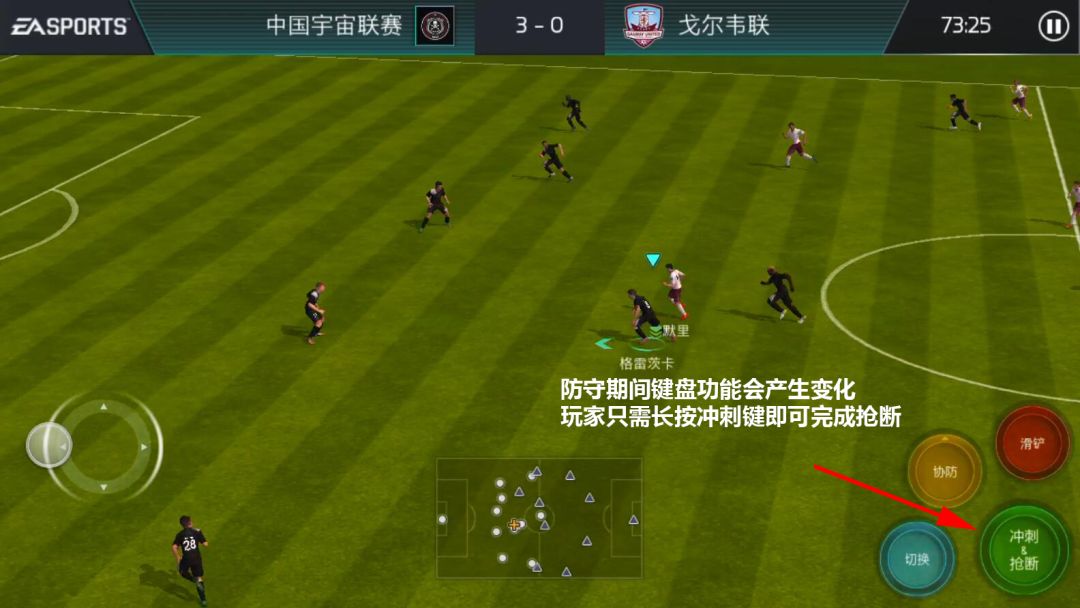 在敌方带球向我方球门进攻时,玩家会自动被系统切换成为“防守模式”。防守模式中,虚拟键盘的键位也获得了一些改变。进攻时的“冲刺/技能”按钮,在防守模式时,会被替换为“冲刺/抢断”。玩家在防守期间,只需长按此按钮,系统即可自动完成抢断。
