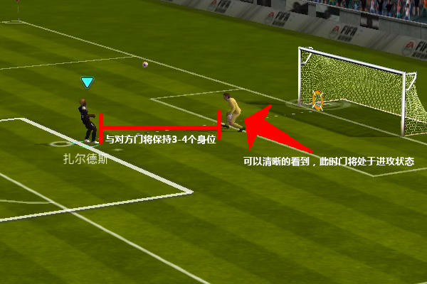 想要成为一个吊射高手,最重要的是距离的把控。吊射适合球员与对方守门员距离较近且守门员有向前冲刺的动作时使用。使用时,最好距离对方守门员3-4个身位为最佳。同时玩家也需注意吊射时角度的把控(下文实战解析中将进一步解读)。