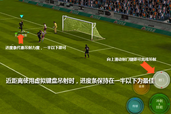手势操作进行吊射时,玩家只需点击球门内任意位置,电脑即自动计算最优弧度进行射门,十分方便。使用虚拟键盘时,则需要将射门按钮向上滑动即可完成吊射。滑动时间越长吊射力度就越大,通常在近距离射门时,进度条在一半以下即可轻松破门。力度过大易导致足球高过球门(如下图所示)。