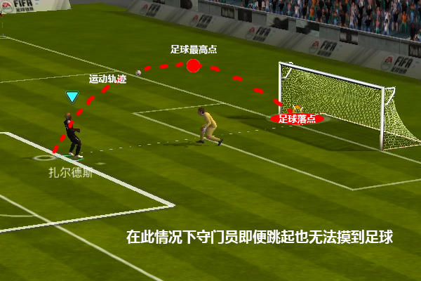 3、位置。在角度调整好后,选择远点进行吊射。即玩家在球门右侧与守门员相遇,吊射落点选在球门左侧死角。切忌选择球门中间位置,此做法易导致吊射高度过低,门将直接抱住皮球(如下图所示)。