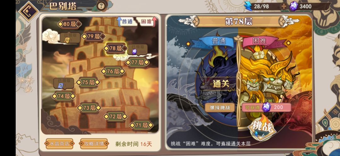 普通塔过了75就好打了能打到96没有强力单体就过不去了 困难层输出的要求比较高差一丢丢没过去