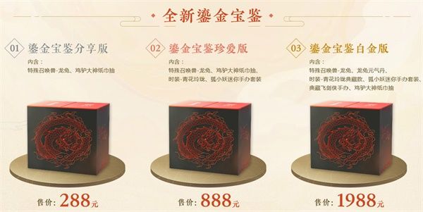 流光四溢,珍品献礼。2019年鎏金宝鉴将为大家带来分享版、珍爱版以及白金版,三个版本内容豪华程度不同售价也不同,大家可以根据自己的选择进行购买,具体内容及售价如下: