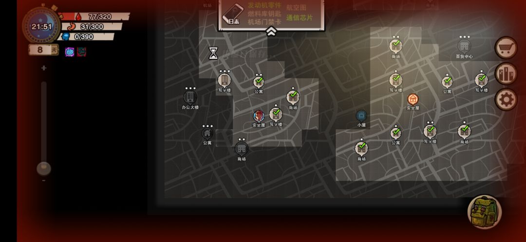 (再次修改:在新版本中,地图内离开(也就是最右边的那个路牌),从那里去大地图,丧尸不会回到原位。只有强行回到主菜单,丧尸才会回到原位。前期可以在第三天去三星房浪,离警察局近的去警察局,因为六楼可以搜掉。前期主要是一,二星房。)