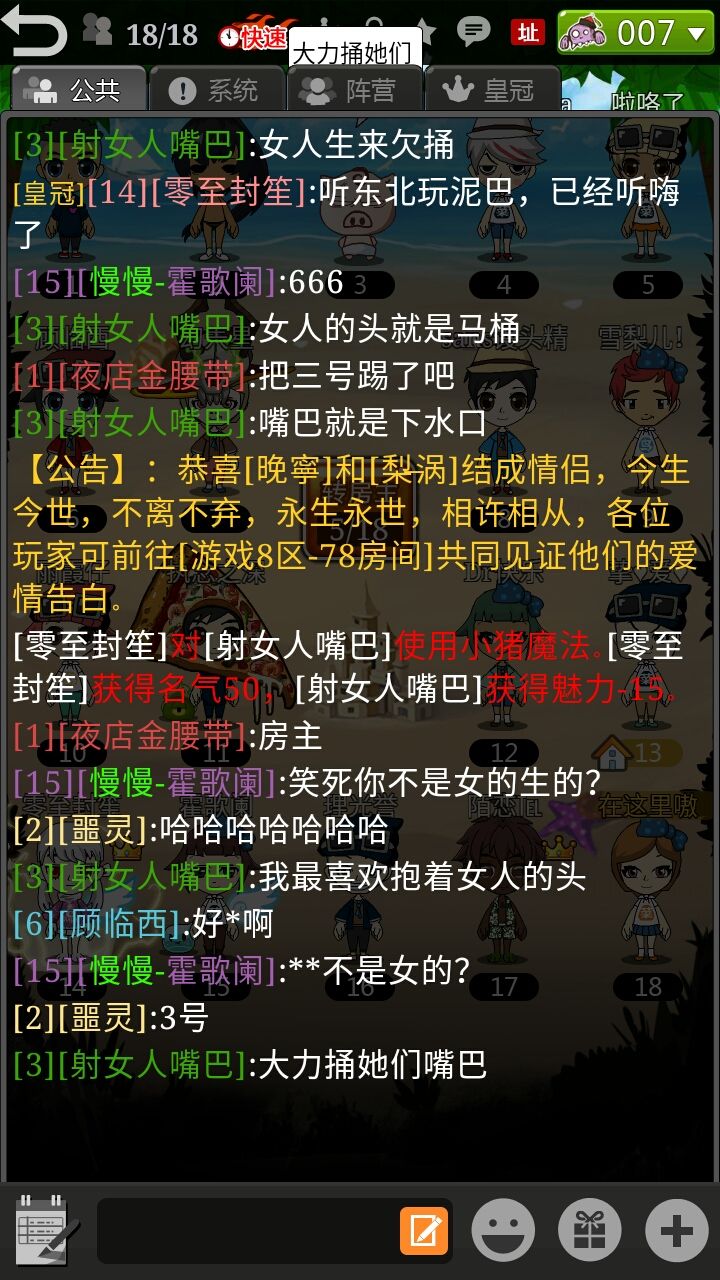 游戏内有很多对女性侮辱的名字,不建议女性玩家入坑呢。鉴于部分虽然有对女性侮辱的名字,但是没有直接打字侮辱我并没有截图。