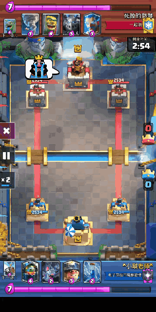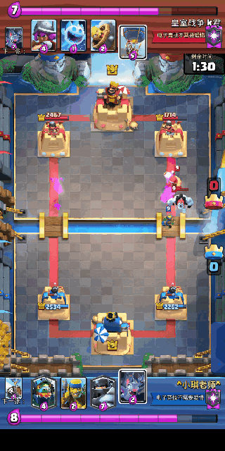 面对推进时超级骑士切后,地狱飞龙在靠近公主塔的安全位置持续输出。如果能完美的吃下一波就可以配合矿工杂毛反打一波。遇到皮卡锥时,电法跟在皮卡后面,一定要把电法切死!超骑被砍几刀问题不大。地狱飞龙一定要保护好。对面的AOE必须死!遇到莽夫气球不要急可能守不住,但是我们可以五五开看谁更快。