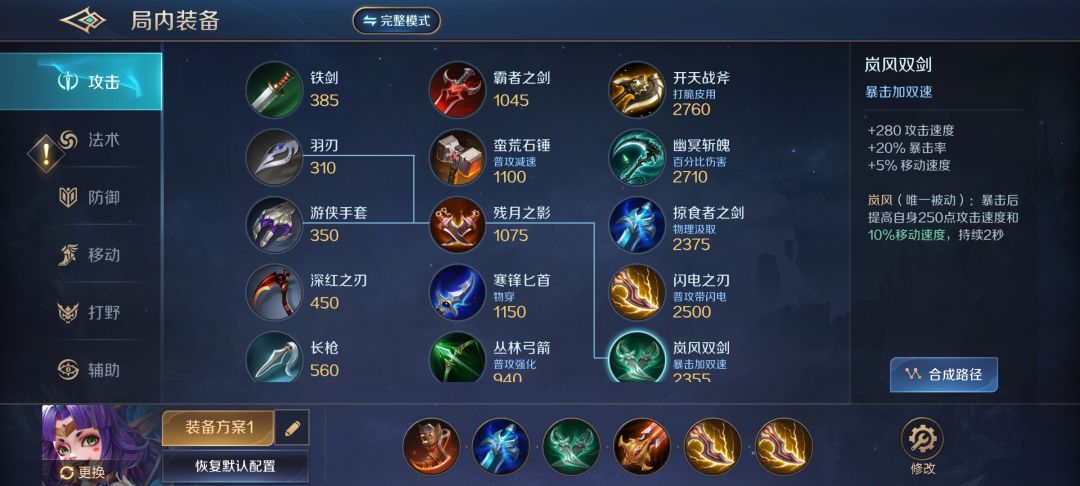 个人建议是攻速加吸血,因为一技能的效果,你射出去的越多收回来造成的伤害也越大,而且这个英雄主要也是靠普攻来打出伤害,吸血呢是保证自己可以尽情的输出,其他装备选择的话,可以出暴击装以及暴击加攻速移速的,最后再来一件名刀护体