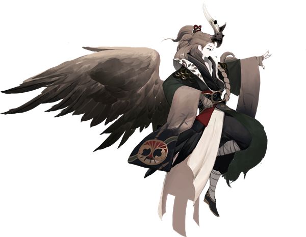 少女银丝金瞳,背茁苍羽,手持法杖。