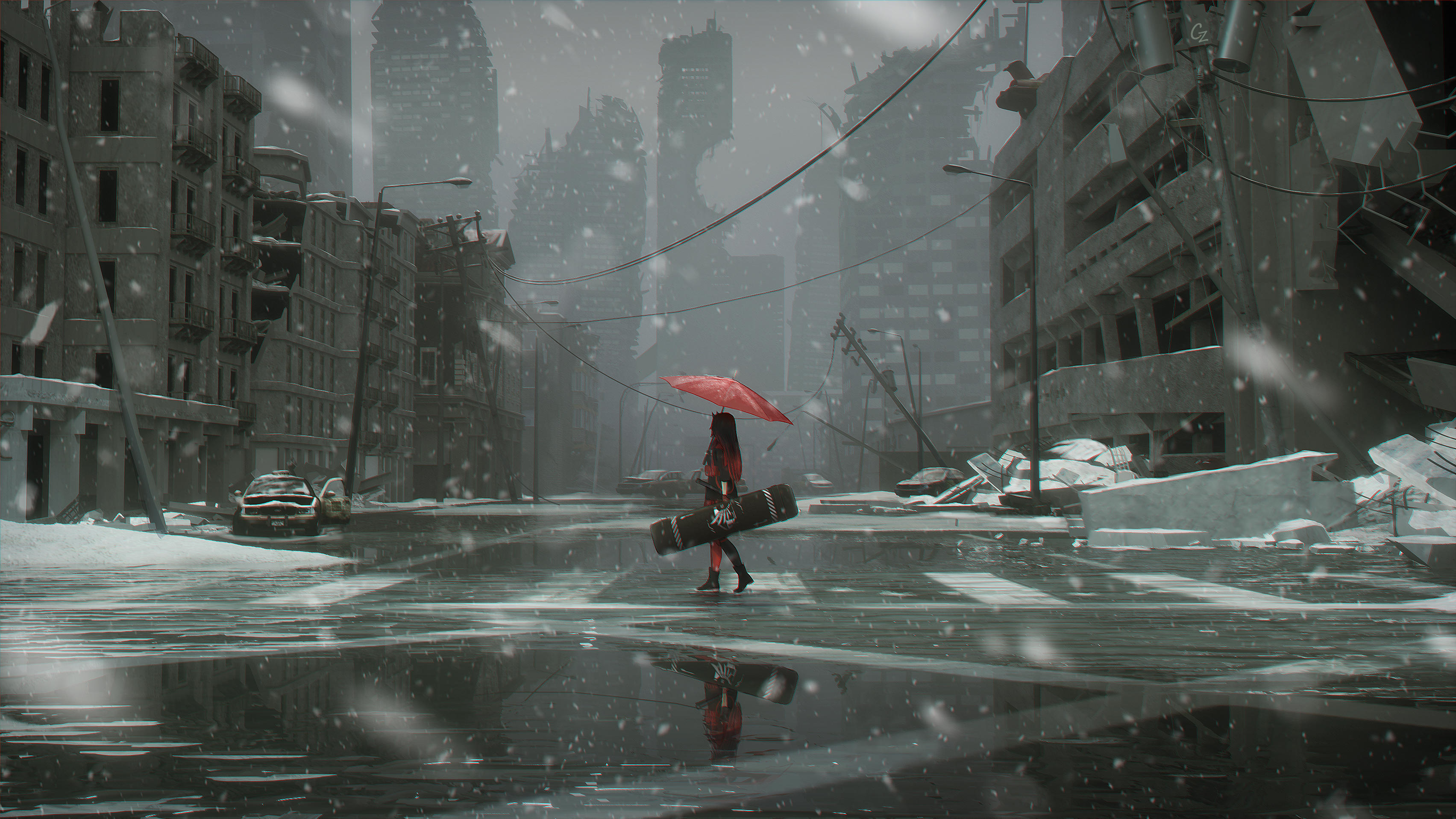 大体就是脉冲背对着我们,露出了可爱的后脑勺,面前是炮火废墟,手搭在灰鸦武器箱上