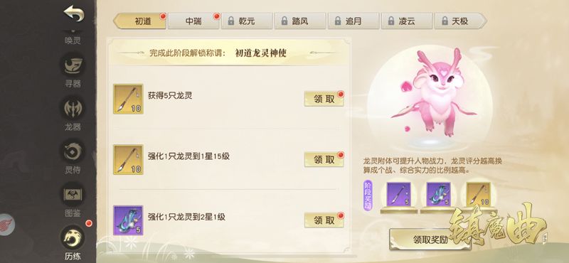 每个阶段中,天命者均有三个不同历练任务,以此了解龙灵与自身如何结合、如何成长培养,并可得龙族备下之秘宝,于当前阶段更快培养龙灵、早日投身抗魔战场!