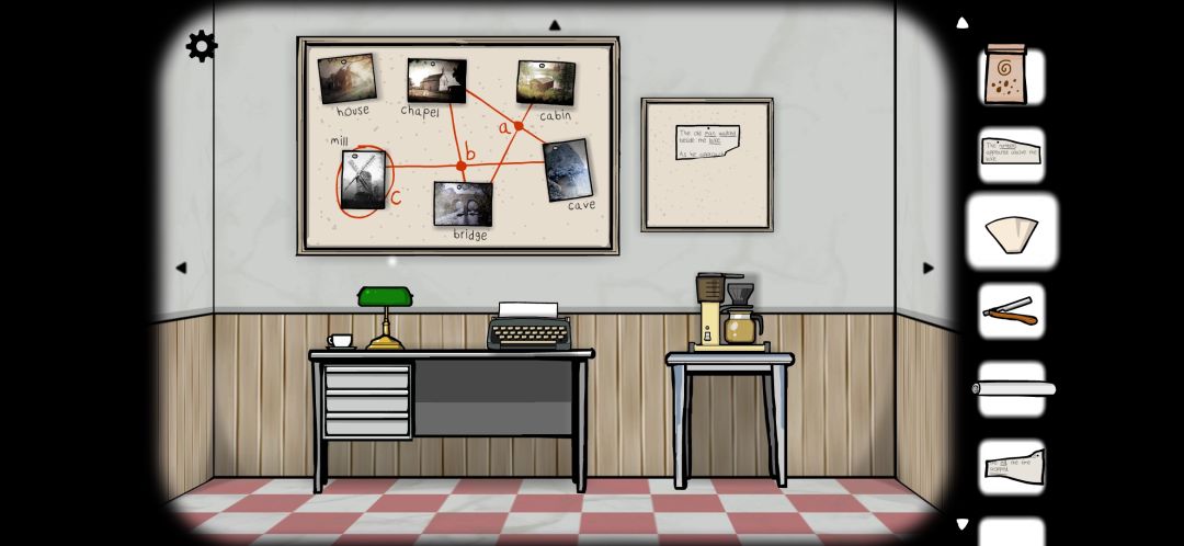 来到办公桌这边,白板上挂着的,正是我从第一部分里得到的证据 。上面标注这五个地名,这么看白班上的信息应该与地图有关。