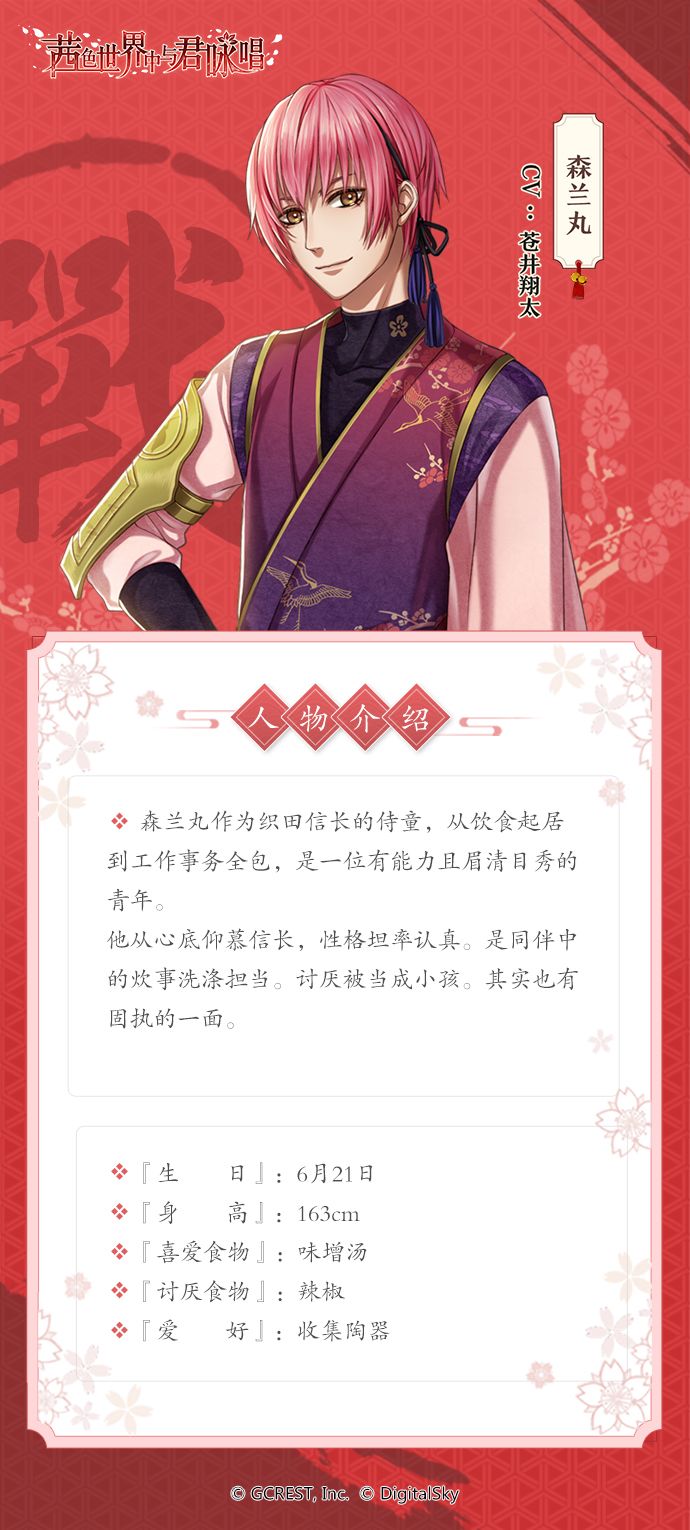 他来自战之国,作为织田信长侍童的他,拥有正直而又认真品质,偶尔也会展露自己固执的一面。