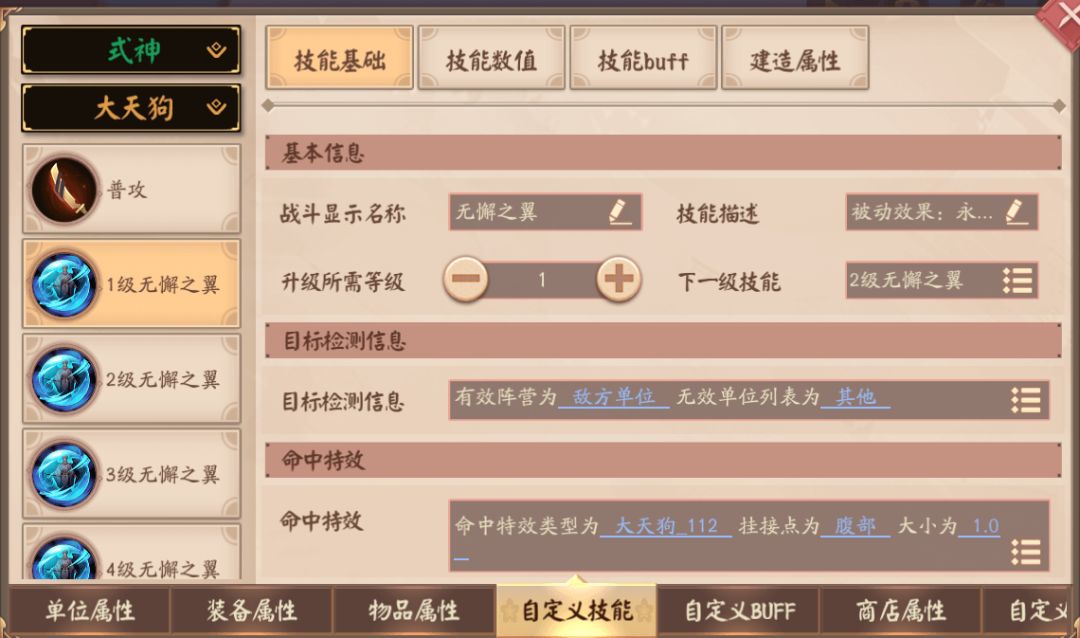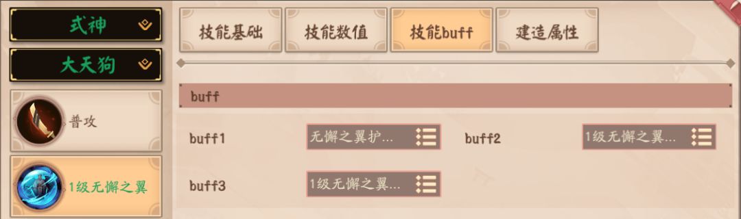 技能buff页签可以编辑该技能所带buff效果,如下图中的1级无懈之翼技能带有3个buff效果,这3个buff类型可以更改配置;不同技能所带的buff个数不同。