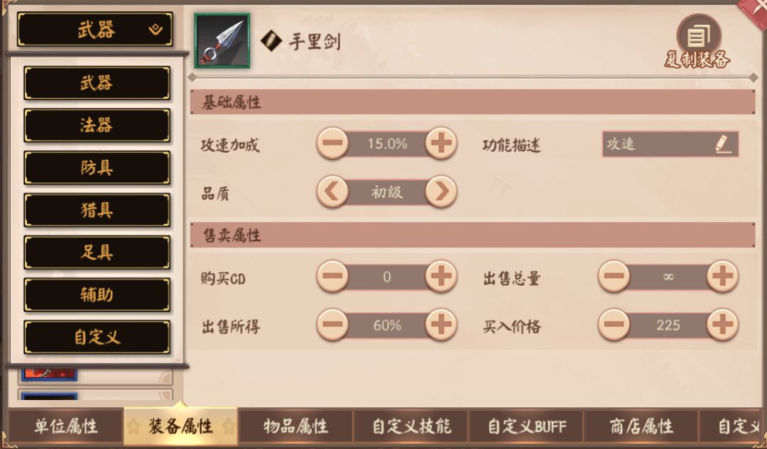 装备属性页签用来编辑所有装备的自定义属性。